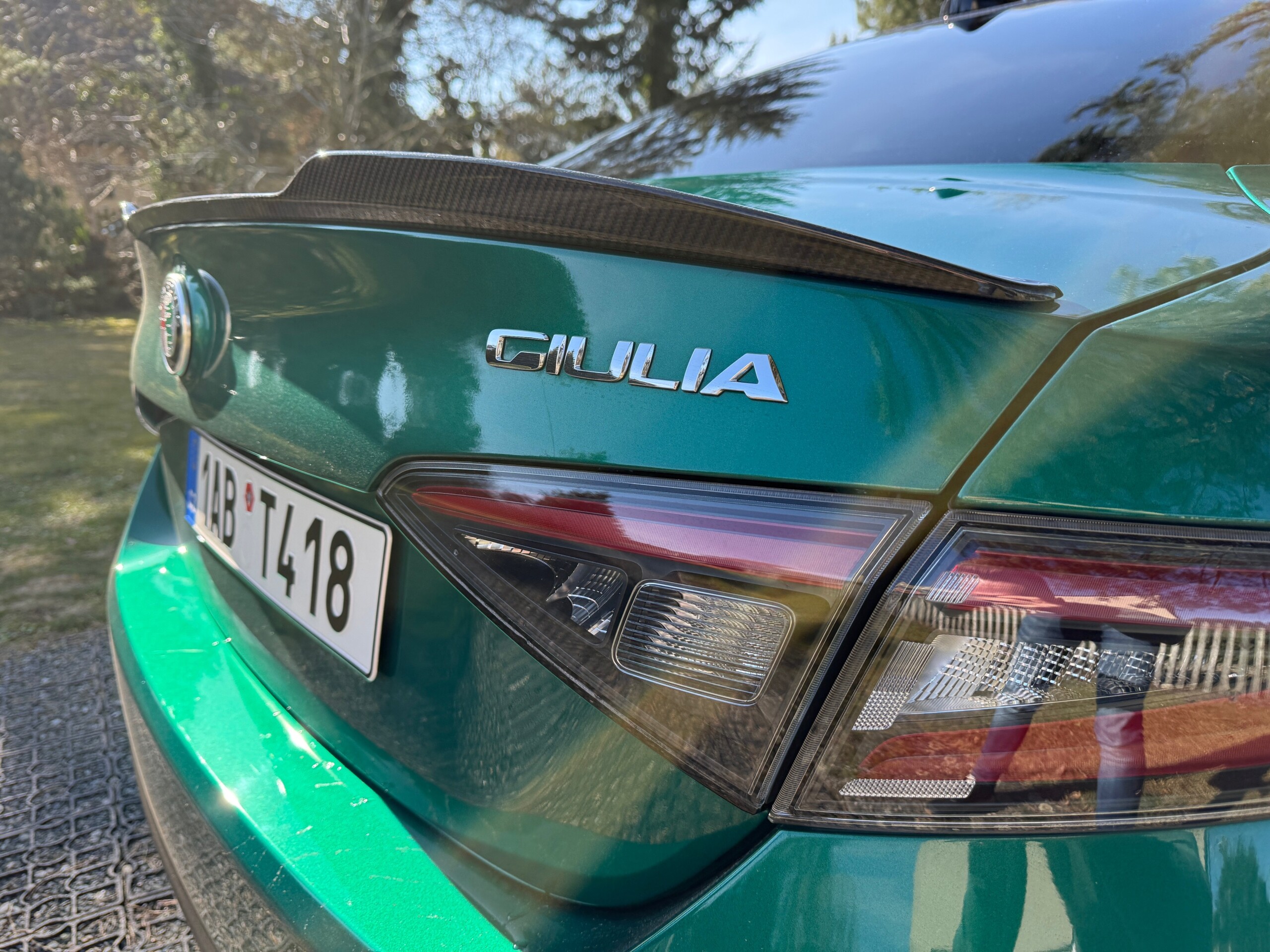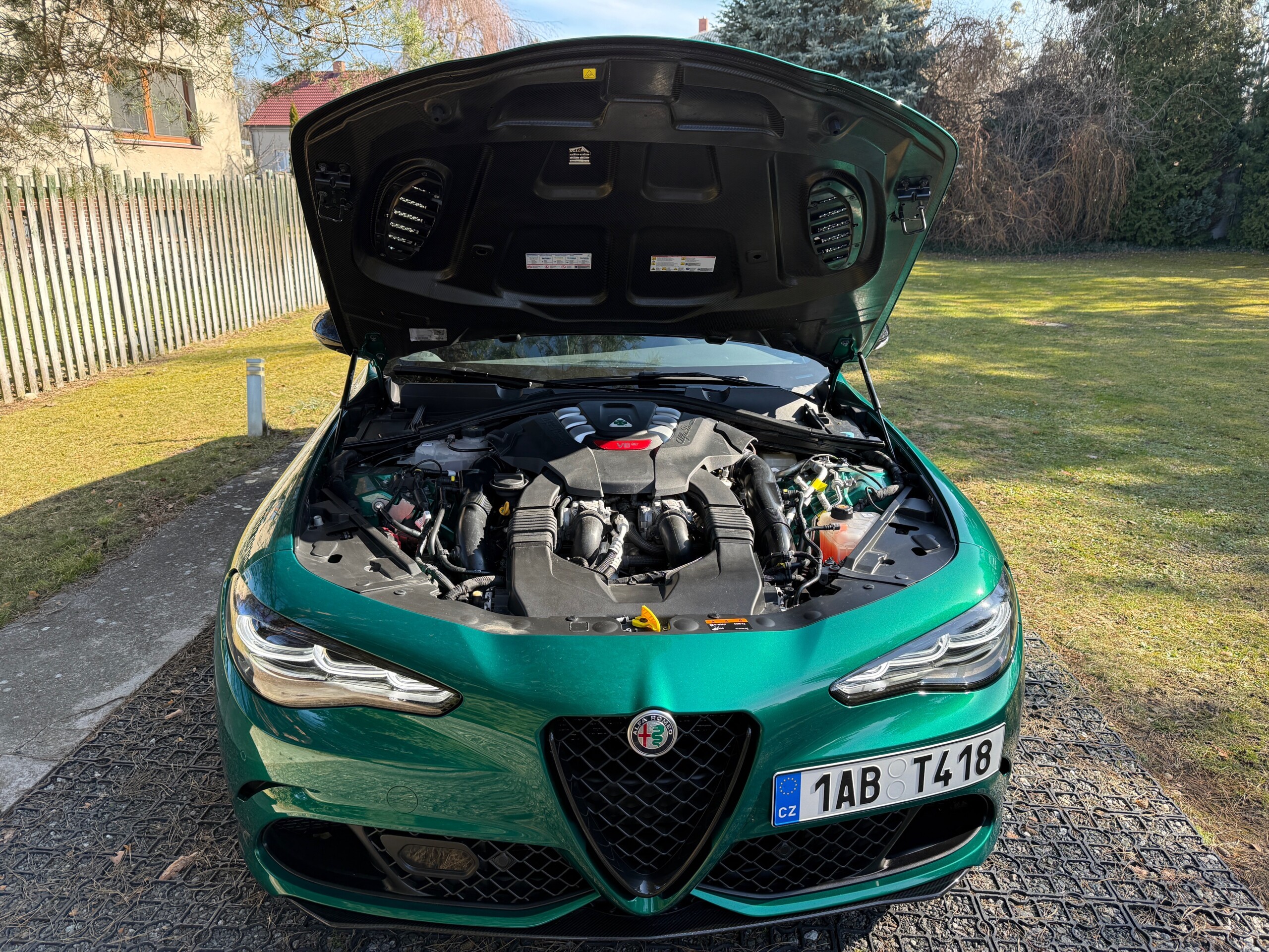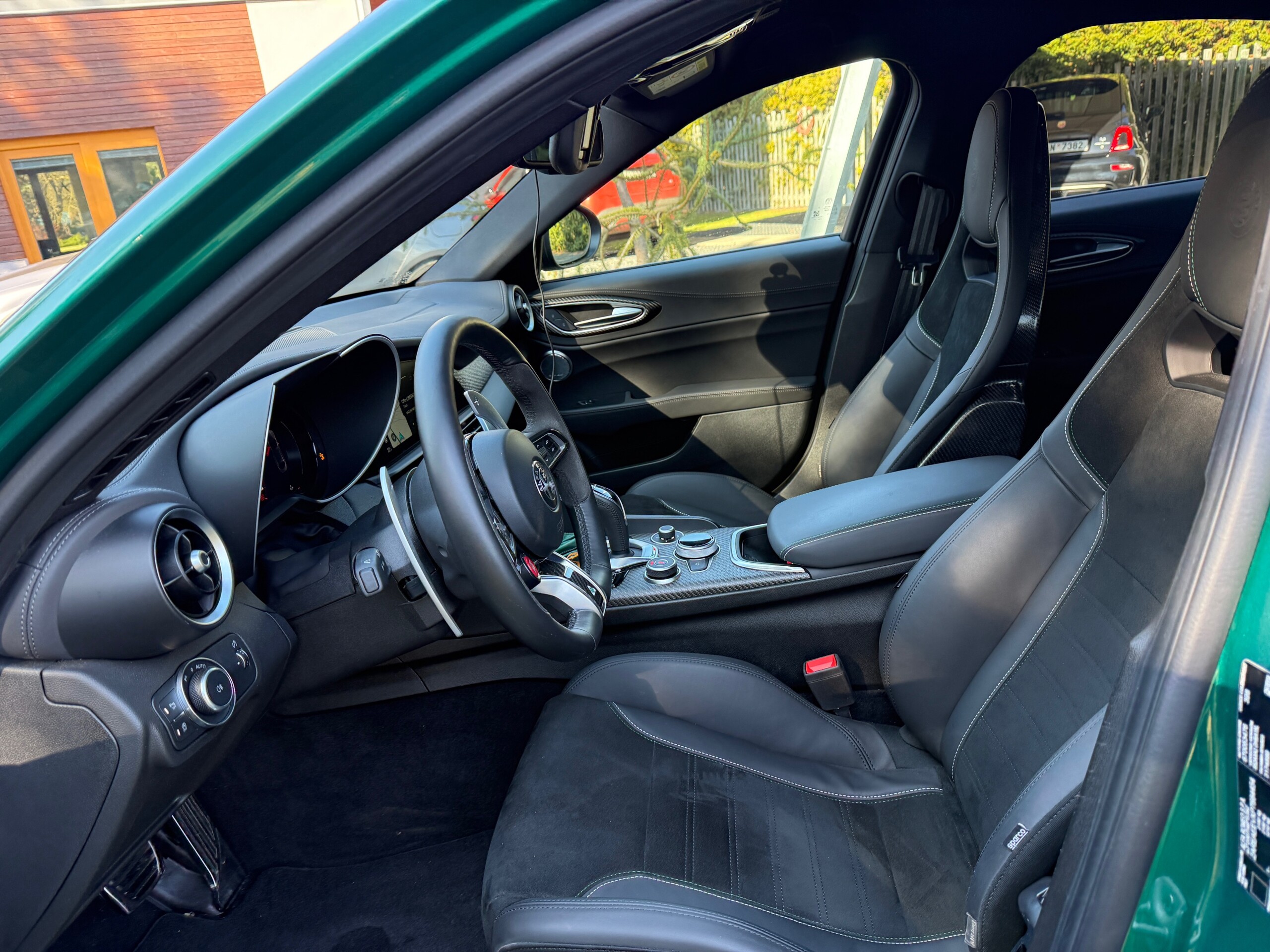 Alfa Romeo Giulia Quadrifoglio MY23, 2.9 V6 BiTurbo 520 k, příplatková Montreal Green, karbonová střecha, Sparco karbonová sedadla, skvělá výbava, záruka do 01/2029. 1. pečlivý majitel, bez okruhů a tvrdého zacházení, pravidelný servis + servis po záběhu. Interiér jako nový, celkově nádherný stav. Jen drobné téměř neznatelné stopy od kamínků na nárazníku. Letní + zimní pneu.