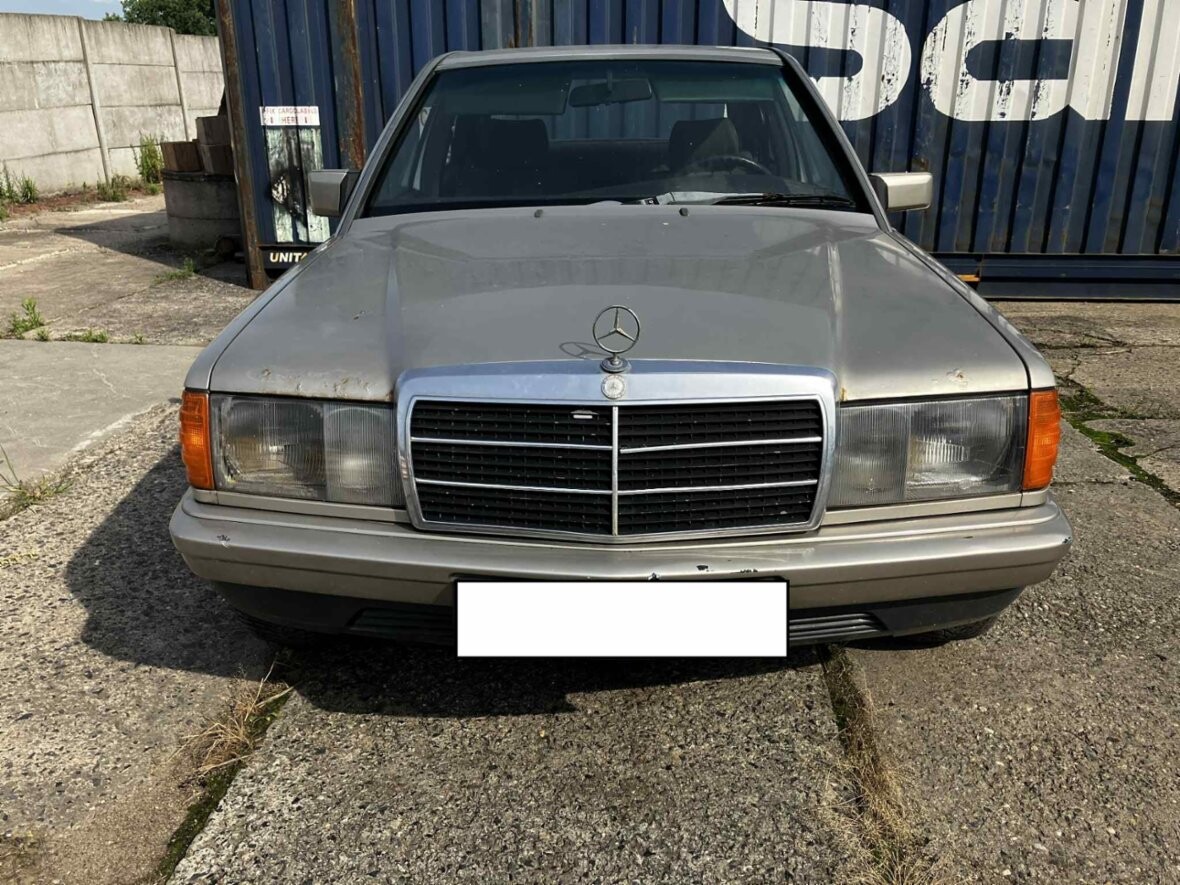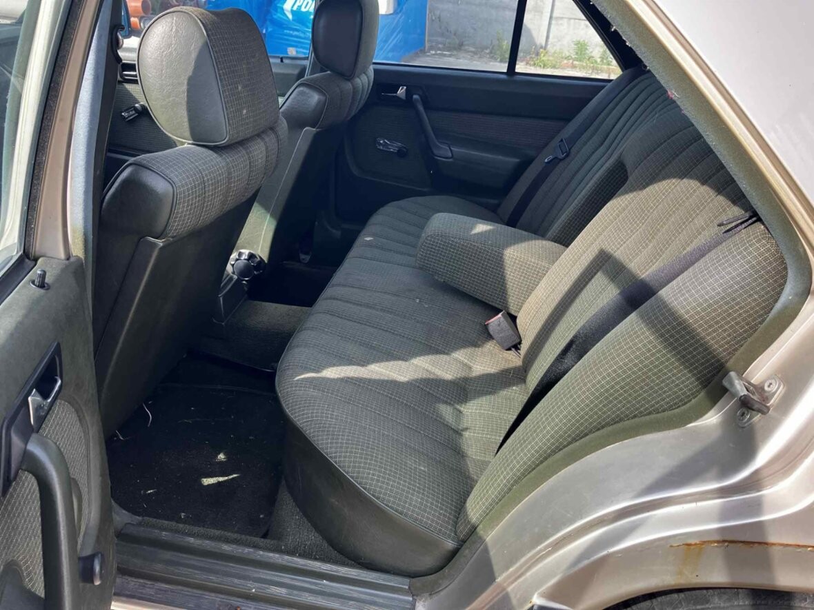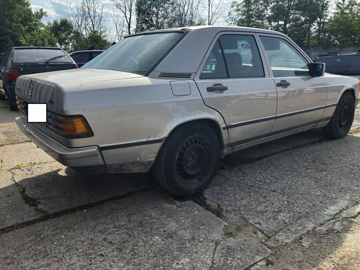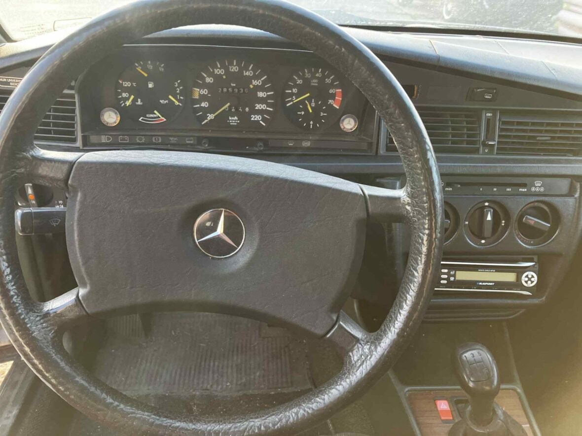 Mercedes-Benz 190 E W201, motor 2.0 benzín, rok 1985, 286.000km, bez TP. Pěkný interiér v zelené barvě. Poměrně slušný lak. Koroze lemů blatníků. Má šíbr. Pojízdný. Perspektivní youngtimer. Vlastním ho 10 let, ale není na to čas.