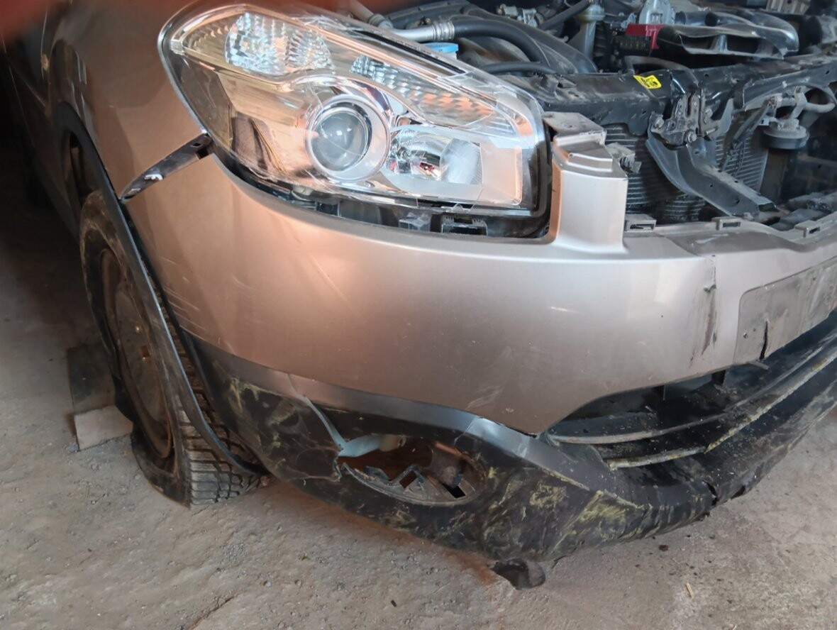 Nissan Quasqai. Havarovaný na předek, vhdný spíše na díly, musí se odtáhnout.