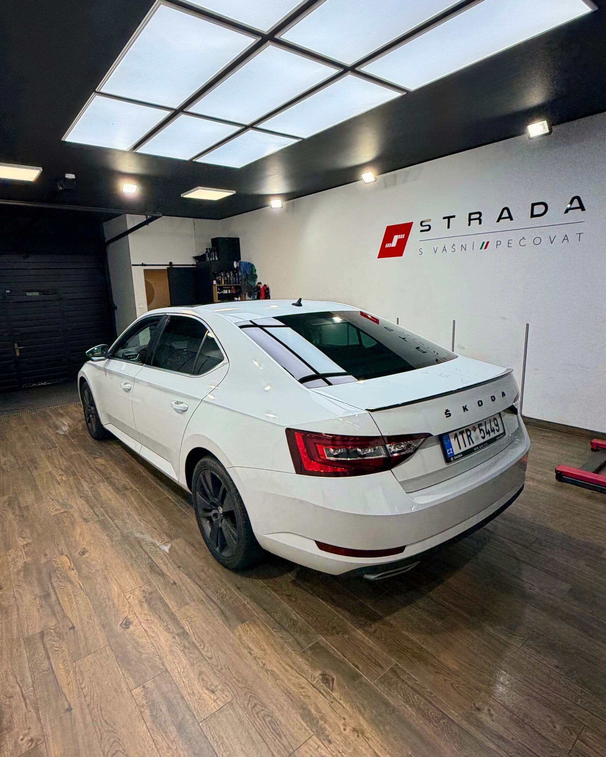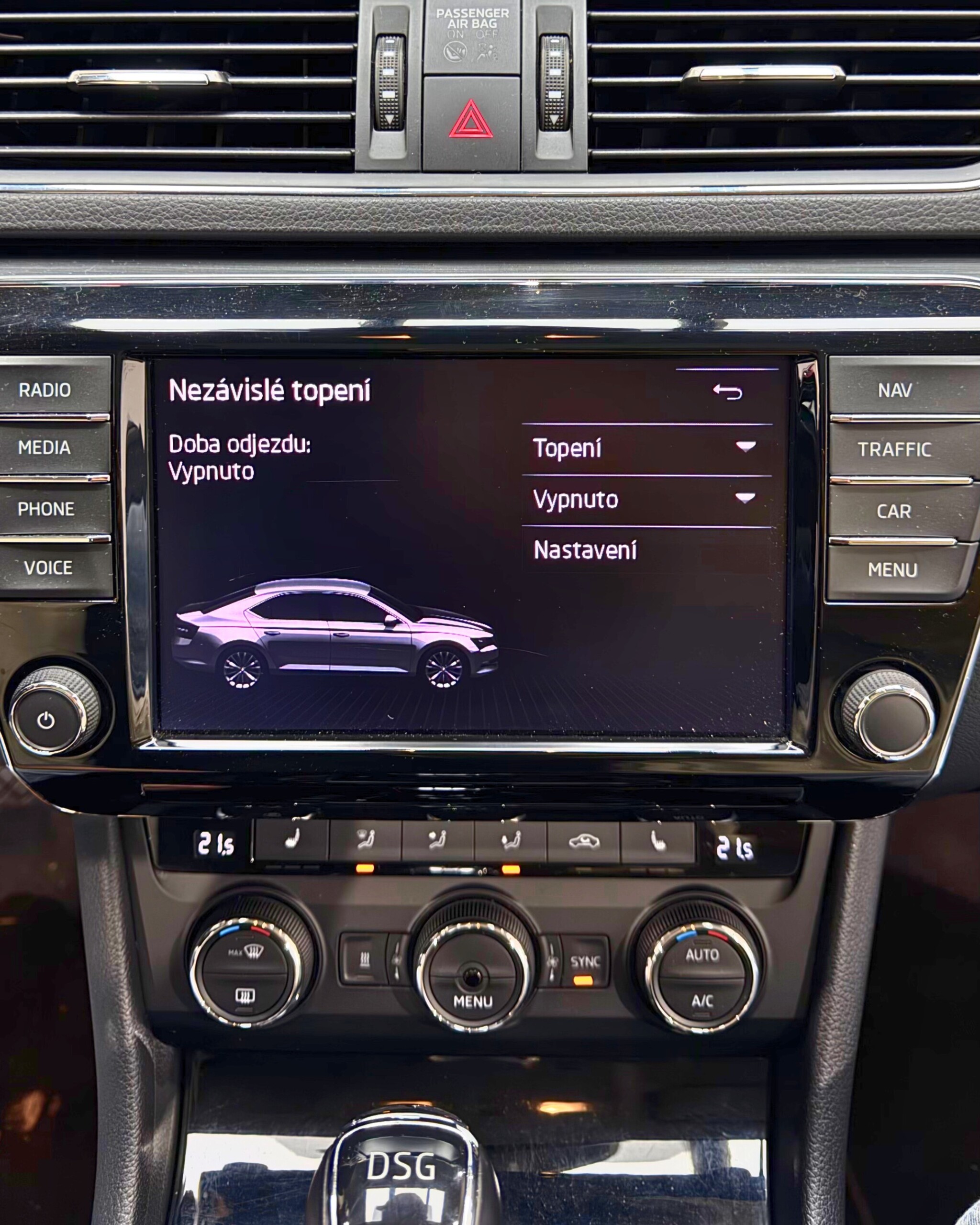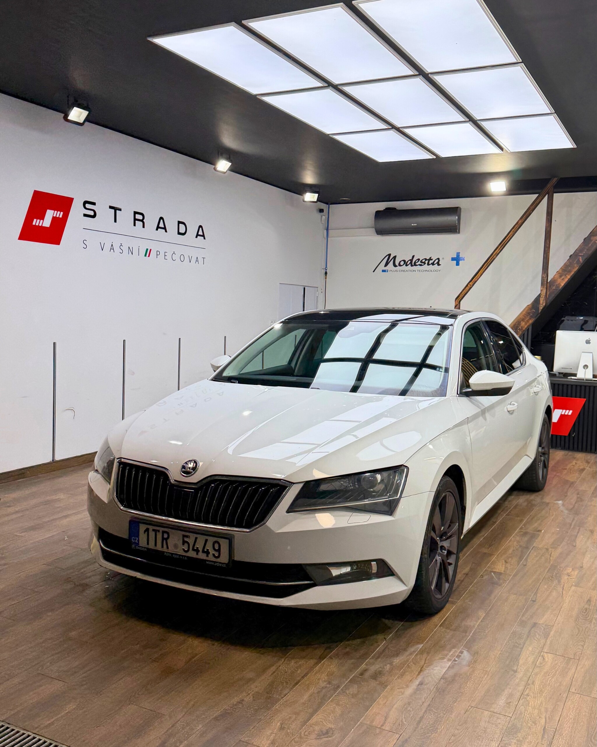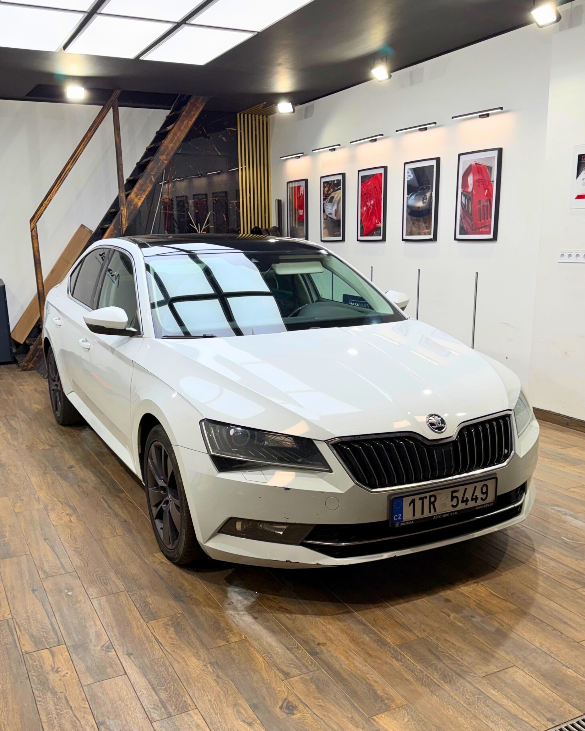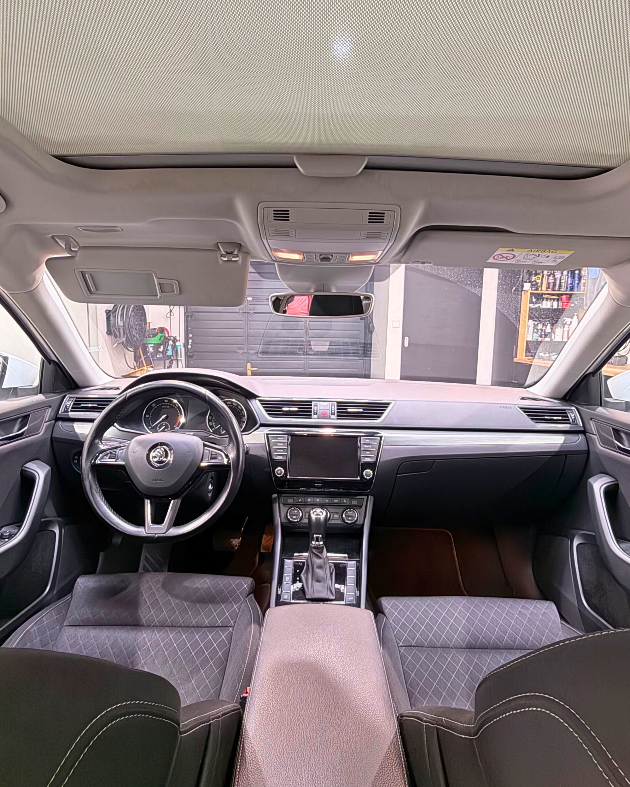 Škoda Superb třetí generace je vybavena dvoulitrovým naftovým motorem o výkonu 140 kW ve spojení s automatickou převodovkou DSG. Vůz nabízí automatickou klimatizaci, tempomat, elektricky ovládané víko zavazadlového prostoru a nezávislé topení. Komfort doplňují sedadla s pamětí a panoramatická střecha, která patří mezi hlavní přednosti této výbavy. Z hlediska kosmetického stavu má vůz drobný dolík od parkování na dveřích u řidiče, lehce podřený přední nárazník a mírně odřený pravý prah.