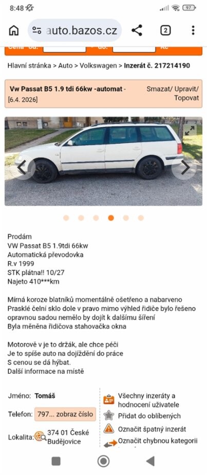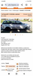 VW Passat, r.v. 1999, STK do 10/27, najeto 410***km . Auto je plně funkční a pojízdné, převodovka automatická , stav odpovídá věku , při zájmu lze doplnit další foto , při rychlém jednání možná sleva.
