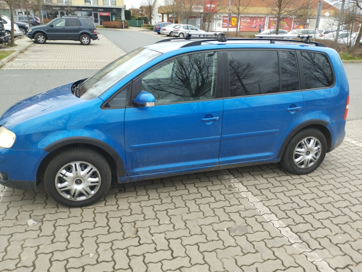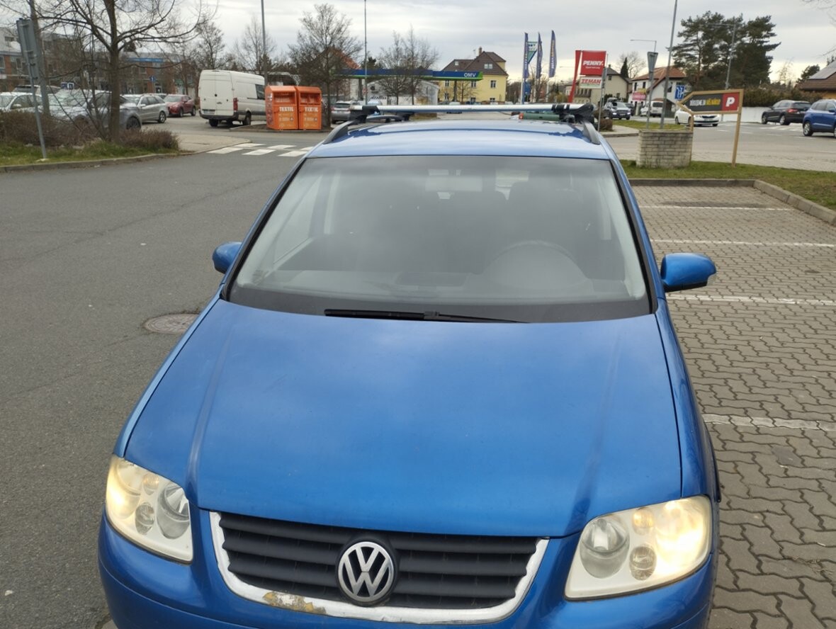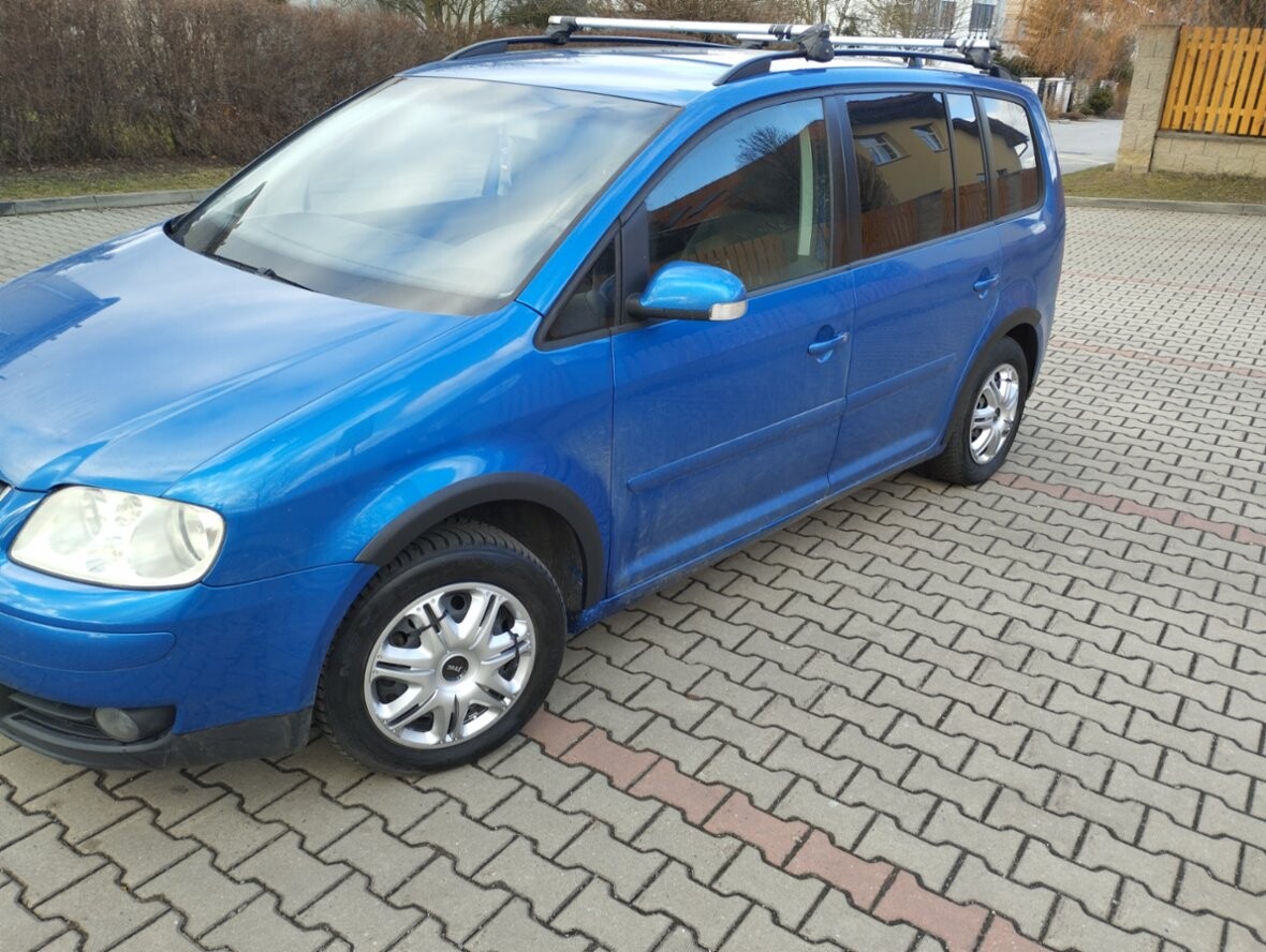 VW Touran 1,9TDI, r. v. 10-2005, 344.000km, 5 míst, 77Kw, modrá met., 6 rychlostí,zakoupeno nové v ČR, airbagy, dig. klima, 4x el. okna, poklice, zahrádka, ližiny, mlhovky, pal. poč., denní svíc., ABS, ESP, závěs, Construct, orig. rádio s CD, kryt zav. prostoru, spotř. 5,5 l nafty, dobrý stav, bez koroze, STK do 4/2027,denně v provozu, Praha.