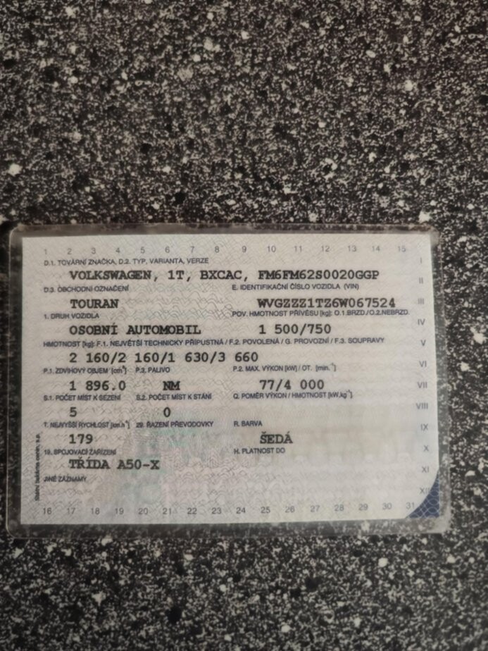 VW Touran 1.TDi - havarovaný na předek, 77kW, r. v. 2006, motor BXCAC vč. agregátů OK,tacho cca 340.000km, VIN na fotce, celý s doklady, Strážný, okr. Prachatice.